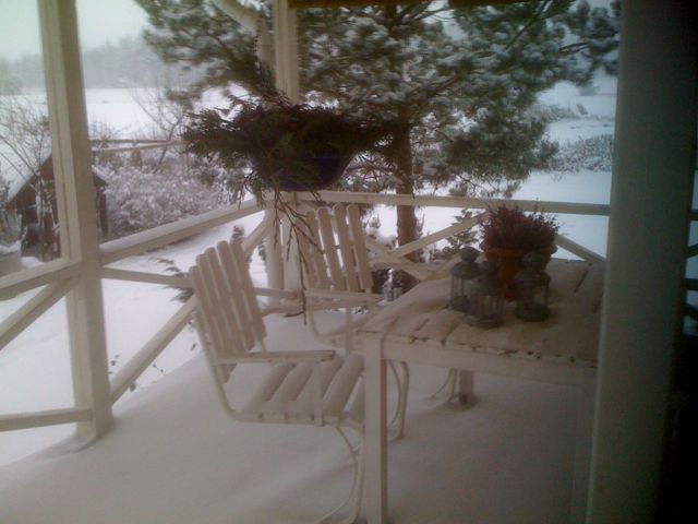 Utsikt från dörren över ett snöindränkt landskap. Fick på vinterdäcken i tid, dock ligger jag fortfarande sjuk, rösten har nästan upphört pga förkylningen.