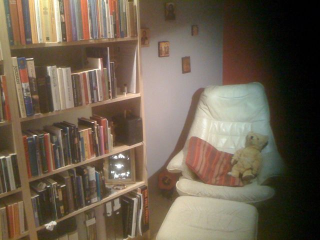 Som präst behöver man förbereda sig, inför predikningar och ex konfirmandmöte. Hemma har jag mina teologiska böcker på mitt hemmakontor. Och i hörnet står min stol som bara är älskad av mig. Och min första nalle bevakar platsen. Här är det viktigt att vara, läsa, be och begrunda. Ett andligt uppdrag kräver andlig fördjupning, att man bottnar i sitt Sanna jag, annars blir man bara en ekande cymbal.