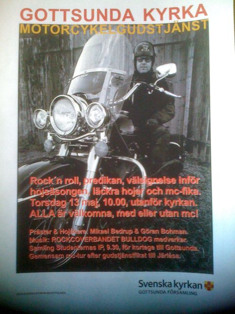 Den 13:e maj kl 1000 utanför Gottsunda kyrka genomför vi vår årliga mc-gudstjänst med rock’n’roll, psalmer, predikan och välsignelse inför hojsäsongen samt avslutande hojfika.