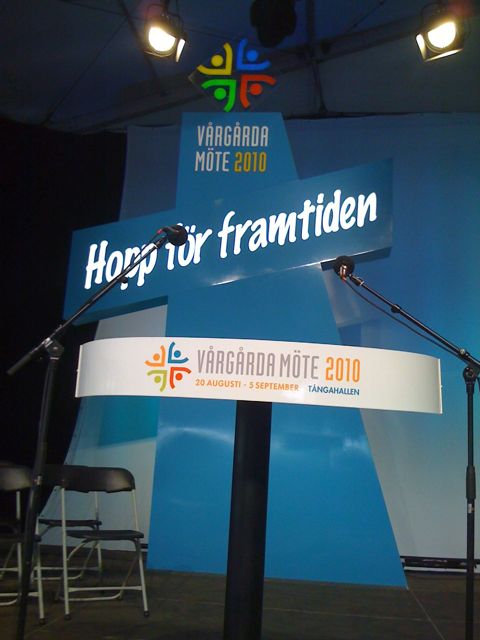 Mötestältet har hela 2000 sittplatser. Längst fram finns en blomstersmyckad estrad med plats för 100 körsångare och musiker. På estraden finns också en intervjuplats där samtliga partiledare ställs mot väggen och därifrån hålls predikan i gudstjänsten. Bakom intervjuplatsen finns devisen ”Hopp för framtiden” i form av ett kors.”